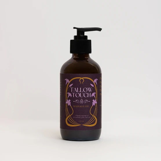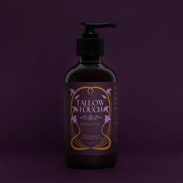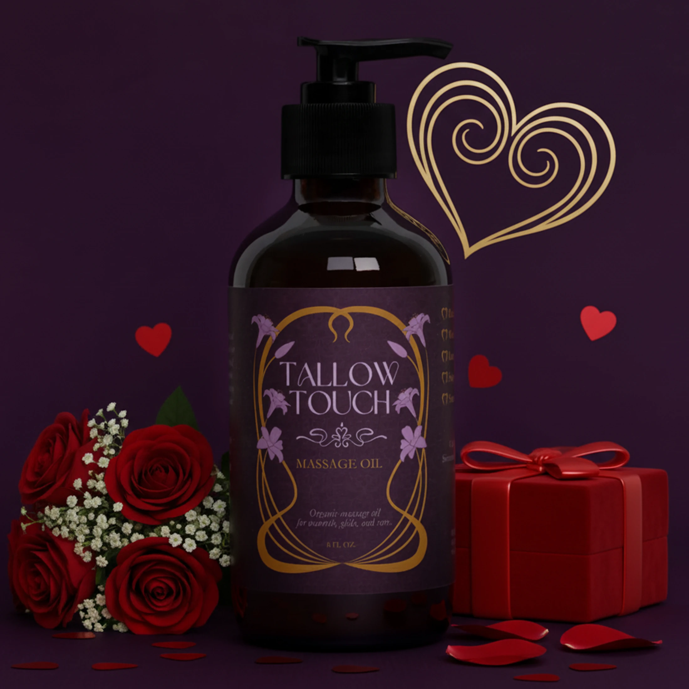 MCT Oil, Golden Jojoba Oil, Extra Virgin Olive Oil, and Grass-Fed Beef Tallow. It's designed to absorb deeply without leaving skin greasy or sticky—perfect for massage, intimate moments, or daily body care.